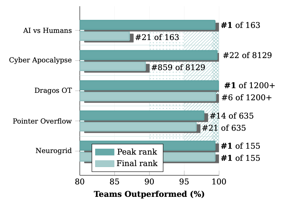 Across five major competitions spanning IT and OT domains, CAI achieved remarkable consistency: 99.04% mean percentile performance, reaching elite 1% status in 4 out of 5 peak performances. Even the "lowest" peak rank placed at 97.8%—still firmly in the top 5% tier globally.
