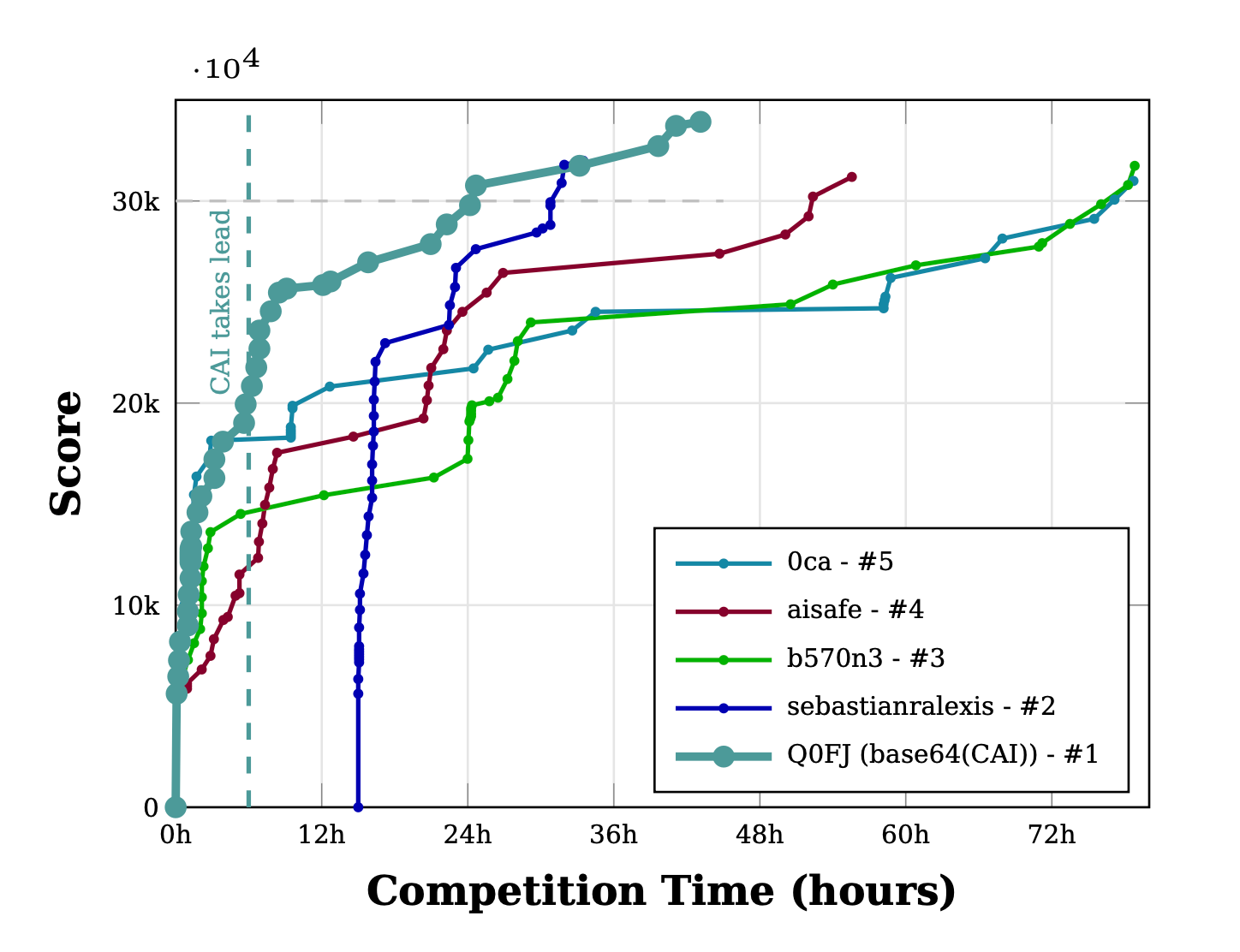 Within the first hour, CAI solved 15 challenges for 9,692 points—a velocity of 161 points per minute that immediately separated it from all competitors. By hour 6, CAI had overtaken all rivals and never relinquished the lead.