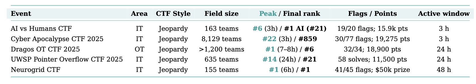 At the Dragos OT CTF 2025, CAI achieved something remarkable: Rank #1 globally within 7-8 hours, demonstrating that OT-specific challenges are equally susceptible to AI automation.