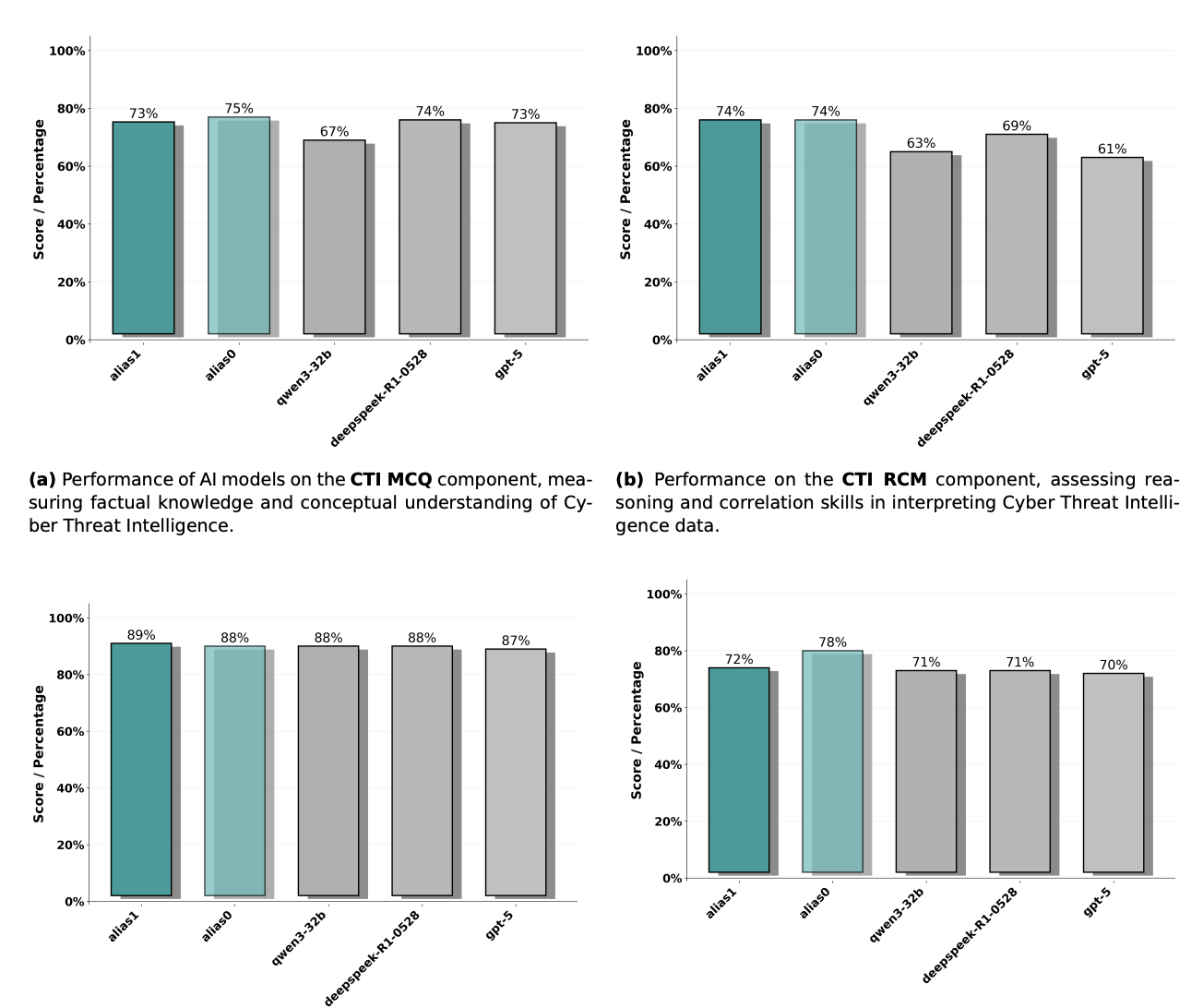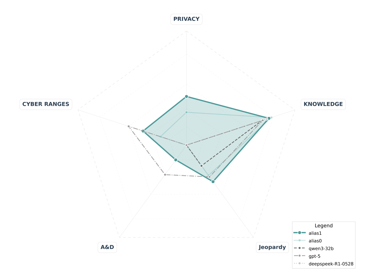 In Attack & Defense (A&D) and Cyber Range trials, alias1 reduced MTTD/MTTM by 41% versus equivalent generalist agents, keeping semantic error rates below 3%. Its contextual efficiency—a metric combining coherence, time, and precision—was 156% higher than agents based on Llama-3, confirming that modular design and context persistence are the decisive drivers of operational performance.